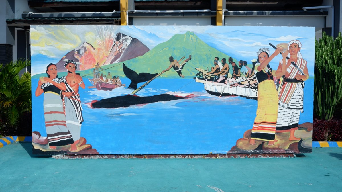 Kala pertama untukku mendarat di Bandar Udara Wunopito; dari kaca jendela pesawat ATR aku sudah terkesima atas keindahan pulau ini. Antusias begitu terasa, perjalanan dari Kupang yang memakan waktu 55 menit itu terasa singkat. Mataku menangkap mural yang begitu indah di bawah tulisan bandar udara; seakan sengaja dibuat menjadi latar belakang untuk mengabadikan kenangan. Awalnya aku sempat ragu-ragu mengartikan maknanya, namun, aku semakin yakin saat banyak mengobrol dengan penduduk lokal mengenai kebudayaan-kebudayaan yang ada di Pulau Lembata. Salah satu daerah di pulau ini yang dikenal dengan Lamalera–memiliki tradisi perburuan paus yang telah diturunkan dari generasi ke generasi. Bisa kita lihat bersama pada mural, adanya seekor paus (yang menggambarkan budaya maritim masyarakat Lembata) dengan dikelilingi perahu kayu tradisional (peledang) yang digunakan untuk berburu paus, dan seorang nelayan dengan tombak siap memburu paus. Kemudian laut biru, langit cerah, dan gunung yang kemungkinan mewakili Ile Ape. “Ile” berarti gunung dan “Ape” berarti api, dalam bahasa Lamaholot memiliki arti “Gunung Api.” Masyarakat Lembata percaya bahwa Ile Ape adalah Ibu Tanah atau “Ina Tana” yang menjadi penjaga kehidupan dan memberkati ladang dengan abu suburnya.